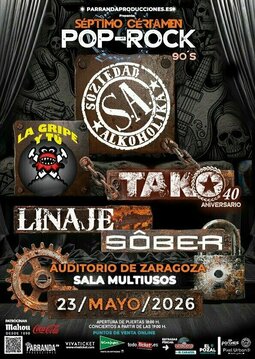 Y YA VAMOS CON NUESTRO SEPTIMO CERTAMEN POP-ROCK 90'S, , SOZIEDAD ALKOHOLIKA , LA GRIPE, TAKO, LINAJE, Y SÔBER.....¡¡¡¡¡TE ESPERAMOS!!!!